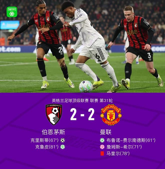 北京时间3月21日英格兰足球顶级联赛 联赛 第31轮,伯恩茅斯主场对阵曼联。伯恩茅斯克里斯蒂破门,克鲁皮破门,詹姆斯-希尔自摆乌龙。曼联布鲁诺-费尔南德斯破门。最终比分伯恩茅斯 2-2 曼联。