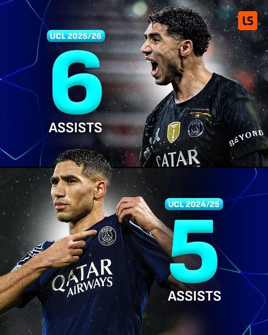 新成就,阿什拉夫成欧冠历史首位连续两个赛季助攻5+的后卫